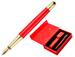Stylo-plume corps en aluminium brossé rouge avec attributs or. Encre bleue. Pointe moyenne. Tracé 0,5 mm. Livré dans un élégant coffrret cadeau décoré à l'intérieur et qui contient un étui en simili cuir avec une fermeture par bouton pression doré.