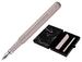 Stylo-plume monochrome gris. Sans agrafe. Encre bleue. Pointe moyenne. Tracé 0,5 mm. Livré dans un élégant coffret cadeau assorti qui contient un étui en simili cuir.