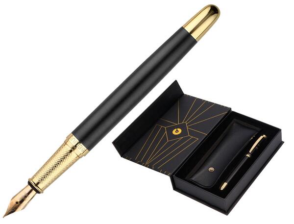 Stylo-plume noir en aluminium avec des détails et attributs or. Encre bleue. Pointe moyenne.Tracé 0,5 mm. Livré dans un élégant coffret cadeau décoré à l'intérieur et à fermeture magnétique. Inclus un étui en simili cuir.