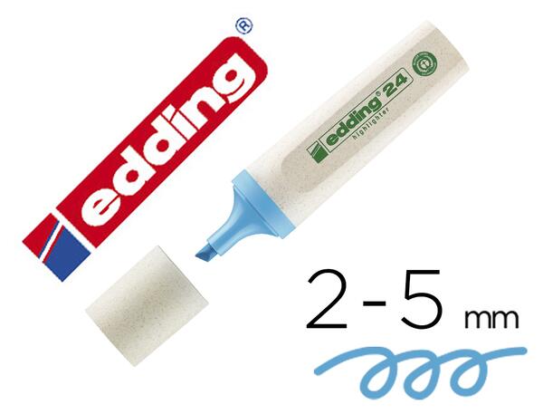 1- Surligneur 2- Pour marquer et mettre en évidence des portions de texte et des notes de manière lumineuse sur presque toutes les surfaces en papier. Produit récompensé par le label écologique Ange bleu. 3- Au moins 90 % du capuchon et du corps sont fabriqués à partir de ressources renouvelables. Produit certifié ClimatePartner. Des informations sur la compensation des émissions de gaz à effet de serre de l'EcoLine sont disponibles à l'adresse suivante : www.ClimatePartner.com/13742-1910-1001. La pointe biseautée a une largeur de trait de 2-5 mm. L'encre fluo est à base d'eau et garantit l'éclat des couleurs. Le produit est rechargeable avec de l'encre de recharge edding HTK 25. 4- Bleu clair 5- 133x143x31mm 6- 27,93 7- 10