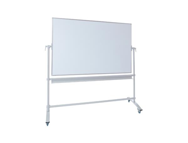 Tableau double face laqué blanc pour écriture au feutre effaçable à sec. Pivotement à 360°. Mobile grâce à ses 4 roulettes avec frein incluses. Dim. (H x L) : 120 x 180 cm