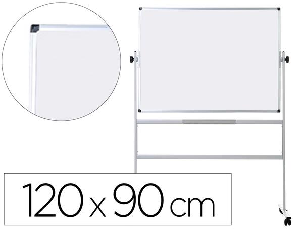 Tableau mélaminé double face pivotant autour d'un axe et ajustement pour son blocage. Cadre en aluminium anodisé et coins en plastique. Structure métallique laquée grise. 4 roulettes de blocage. Large auget pour accessoires. Dimensions du tableau : 120 x 90 cm. Dimensions : 55 x 127 x 180 cm.