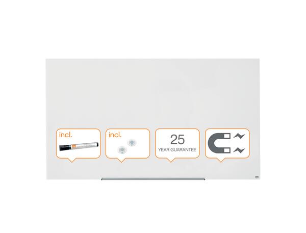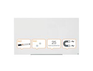 Tableau magnétique en verre, à l'aspect épuré et élégant, avec auget porte-marqueurs amovible. Surface magnétique en verre sécurité offrant une excellente effaçabilité et une résistance extrême aux taches d'encre, traces de marqueur, rayures et bosses Élégant design sans cadre maximisant la surface d'écriture avec auget amovible Système InvisaMount' facilitant le montage avec des fixations soigneusement dissimulées derrière le tableau Taille : 1900x1000 mm - format widescreen Surface garantie 25 ans