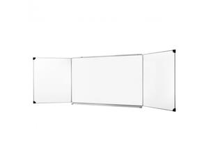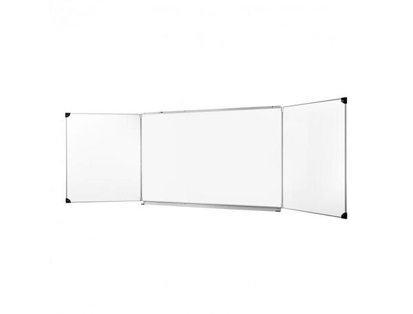 Surface d'écriture garantie à vie : tôle émaillée. Encadrement en aluminium anodisé. Rail supérieur muni de crochets porte-documents. Auget en aluminium anodisé sur toute la longueur du panneau central. Protection des extrémités de l'auget et des coins afin d'éviter les accidents avec les angles vifs. Système de blocage des volets en position ouverte et fermée pour une meilleure stabilité lors de l'écriture. H 120 x L 200 cm + 2 volets H 120 x L 100 cm - Blanc
