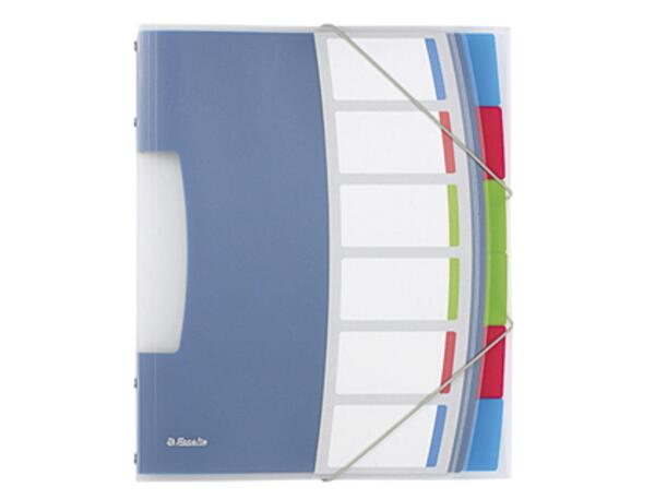 En polypropylène 5/10ème translucide. Pochettes 3 rabats sur le verso. Fermeture par élastique. Index amovible sur la couverture. Étiquette au dos au design tendance. Onglets colorés. Dimensions : 266 x 320 mm.