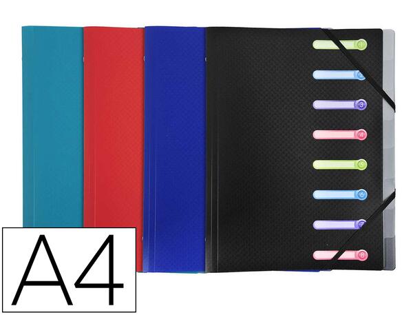 Avec élastiques et fenêtres prédécoupées, couverture polypro 5/10e. Intérieur en polypro cristal 3/10e, fermetures par élastiques, format 24 x 32 cm pour A4. Couleurs assorties. 8 compartiments - Le trieur