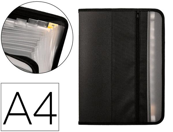 Trieur Liderpapel en polypropylène A4 noire avec bord noir 13 compartiments avec fermeture éclair. Etiquettes de mois et a-z incluses. 13 compartiments. Poche extérieure zippée. Fabriquée en polypropylène. 750 microns. Compartiments de 200 microns. Format Din A4.