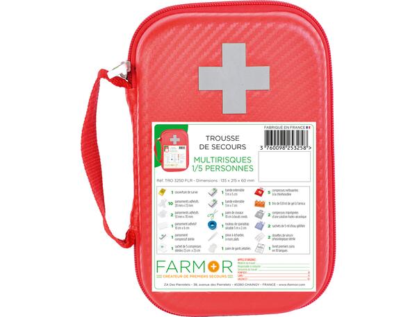 Fermeture par zip - Accroche ceinture par sangle. Multi poches de rangement. Trousse en PU rouge fluorescent avec Croix rétro-réfléchissante. Contenu : 1 couverture de survie, 10 pansements adhésifs 20 x 72 mm, 2 pansements adhésifs 53 x 70 mm, 1 pansement adhésif 10 x 6 cm, 1 pansement compressif stérile, 1 sachet de 5 compresses stériles 7,5 x 7,5 cm, 1 bande extensible de 3 m x 5 cm, 1 bande extensible de 3 m x 7 cm, 1 rouleau de sparadrap sécable 5 m x 2 cm, 1 paire de ciseaux 13 cm à bouts ronds, 1 pince à échardes à mors plats, 1 paire de gants jetables, 5 compresses imprégnées de solution nettoyante cutanée à la Chlorhexidine, 1 trio de 0.8 ml de gel à l'arnica, 2 lingettes imprégnées d'une solution hydro-alcoolique, 2 sachets de 5 ml d'eau gélifiée, 2 dosettes de sérum physiologique stérile 5 ml et 1 livret premiers soins en 10 langues