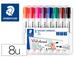 Feutre universel pour la rétroprojection et la plupart des surfaces : papier, carton, film de rétroprojection, plastique, métal, polystyrène, verre, porcelaine, bois, cuir, pierre, ainsi que les CD et DVD. Encre dry safe (test ISO 554), permanente, à base d'alcool sans xylène ni toluène, quasi inodore, résistante à l'eau et aux frottements sur la plupart des surfaces, aux intempéries (encre noire) et à la lumière (encre noire et marron). Séchage rapide, idéal pour les gauchers. Corps et capuchon avec clip en polypropylène pour une longue durée de vie. Sécurité avion. Recharge propre et pratique avec flacon encreur (références 158358, 158359, 158360 et 158361).