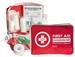 En nylon rouge. Contenu : 1 couverture de survie, 5 compresses stériles de 50 x 50 mm, 4 compresses désinfectantes, 10 pansements adhésifs assortis, 2 bandes extensibles de 3 m (50 mm + 70 mm), 1 ruban de sparadrap, 1 pansement compressif stérile 8x10cm (PM + GM), 2 clips de fixation, 1 paire de ciseaux, 1 pince métal à échardes et 1 paire de gants.